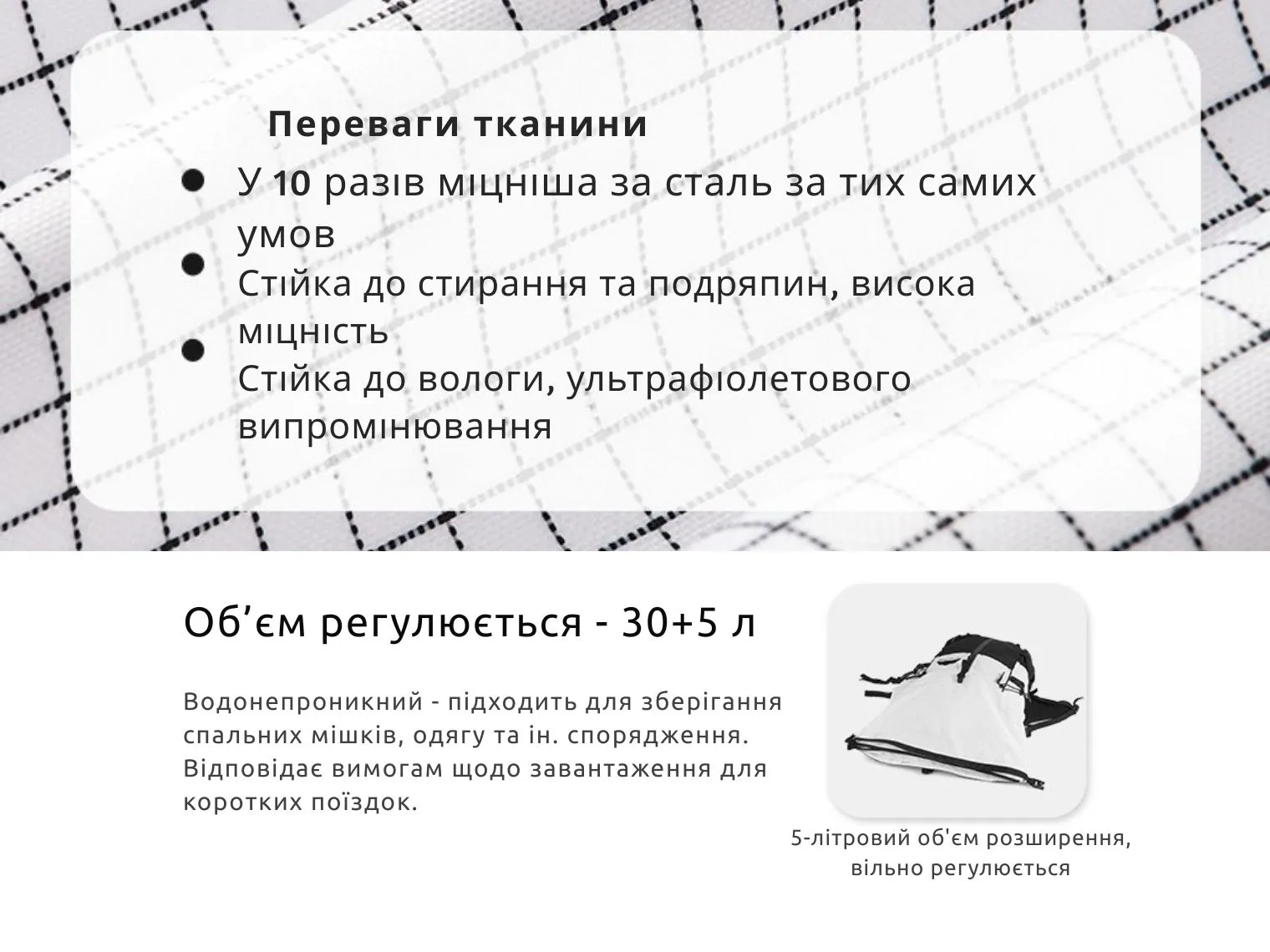 - Расширяемый объём — 30 л + дополнительные 5 л.